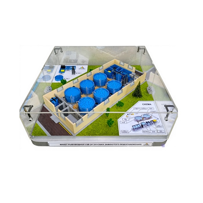 Макет представляет собой уменьшенную модель рыбоводной установки замкнутого водоснабжения. Объекты рыбоводной УЗВ обозначены. Исполнение макета – настольное.