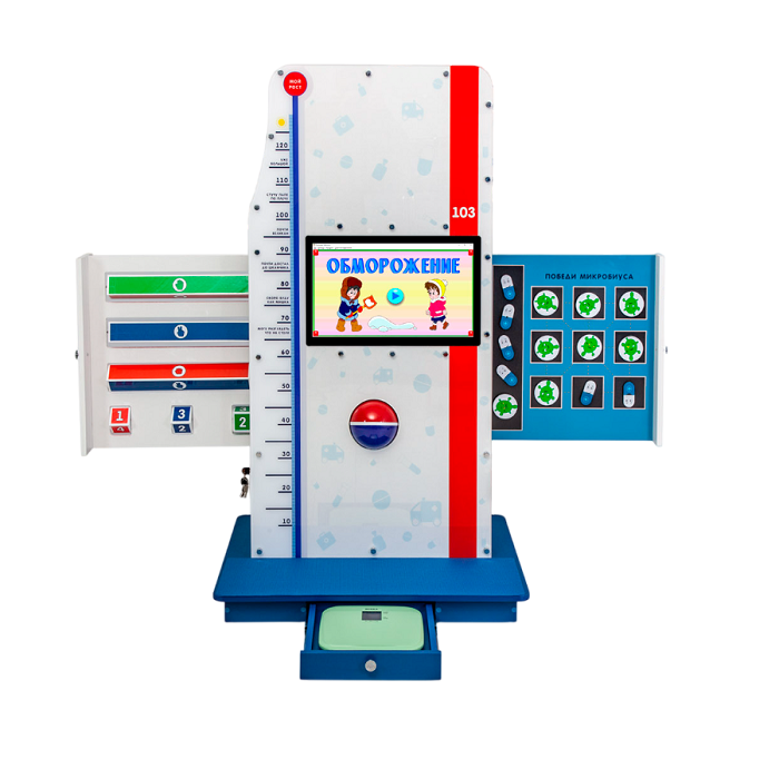 - Сенсорный комплекс имеет встроенный ростомер со светодиодной подсветкой, электронные весы на выкатной подставке, предустановленное программное обеспечение и два развивающих игровых модуля.