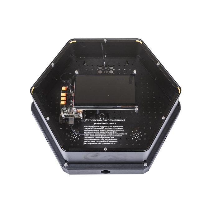 Интерактивный модуль для оформления зон рекреации, кабинетов, IT-полигона, библиотеки, медиа зоны. Модуль демонстрирует принцип работы cистемы распознавания позы человека на основе искусственного интеллекта. Выполнен в форме шестиугольной призмы с интерактивным наполнением.