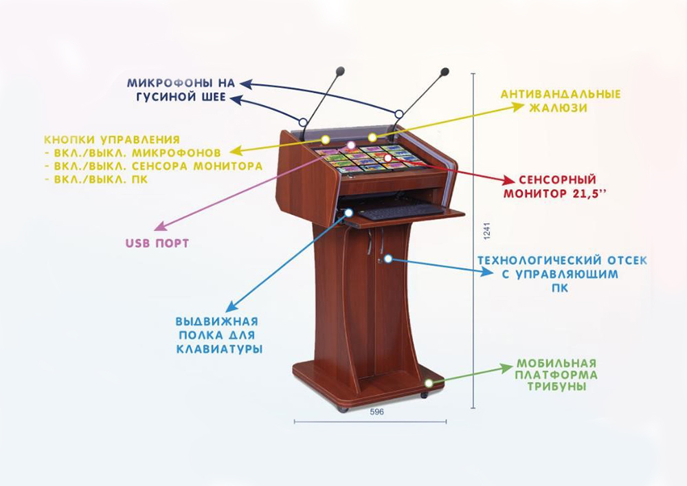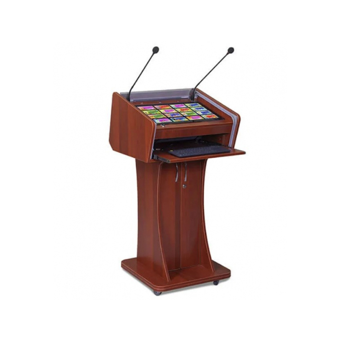 Корпус трибуны мы выполнили из надежного материала – плит ЛДСП, цвет которых вы выбираете самостоятельно. Эта современная интерактивная мультимедийная трибуна будет отлично смотреться в интерьере любого конференц-зала.