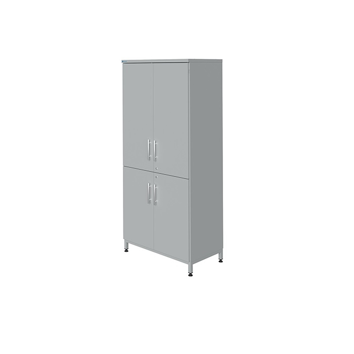 Две верхние и две нижние дверцы глухие и имеют объемную замкнутую конструкцию из двойной листовой стали толщиной 0,8 мм, нижние дверцы закрываются на замок. Нижнее отделение укомплектовано одной съемной металлической полкой. Петли регулируемые и позволяют менять положение двери в трех направлениях. Все четыре двери снабжены вертикально установленными металлическими ручками рейлинг. Опорный нижний каркас шкафа изготовлен из профильной трубы квадратного сечения 20х20х1,5 мм. Ножки каркаса укомплектованы усиленными винтами регулировки высоты для компенсирования неровностей полов при установке мебели. Опоры дают возможность регулировки по высоте плюс/минус 20 мм. Винты опор стальные, с гальваническим покрытием, снизу имеют пластиковое покрытие, защищающее пол от царапин.