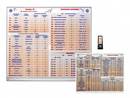 Интерактивный стенд представляет собой интерактивную световую панель, на которой расположена Международная система единиц, физические постоянные и приставки. Стенд снабжен программным обеспечением "Виртуальный учитель". Управление работой стенда осуществляется с сенсорного беспроводного пульта управления.