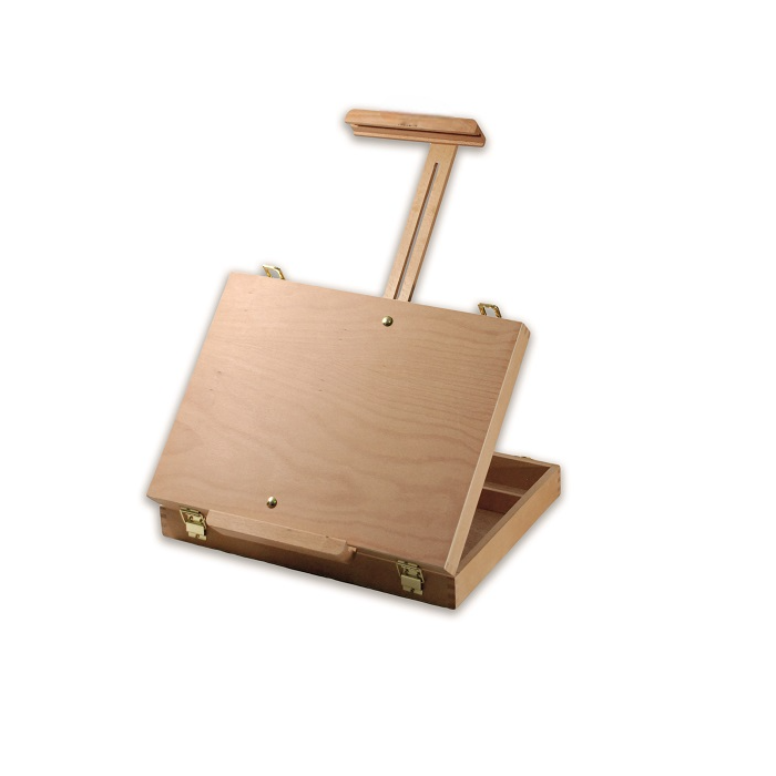Удобный настольный этюдник сочетает в себе функции мольберта и ящика для хранения кистей и красок. За счет того, что регулируется как верхний бегунок, так и нижняя планка, этот этюдник легко удерживает холсты больших размеров. Выполнен из бука, покрыт лаком.