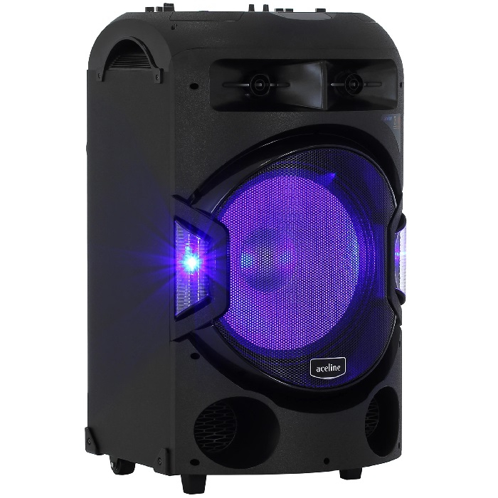 Беспроводная синхронизация с источниками звука выполняется по технологии Wi-Fi. Для проводного подключения устройств есть порты USB, разъем AUX, считыватели карты памяти SD, вход для микрофона. Прослушивать аудио можно через встроенный FM-приемник. Одна из особенностей колонки – яркая подсветка. Портативная аудиосистема Aceline V880 работает от сети и аккумулятора емкостью 9000 мА*ч.