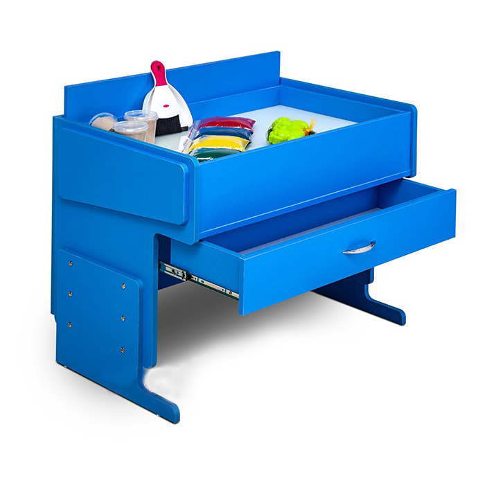 Многофункциональный тактильный комплекс-парта, представляет собой комбинированное рабочее место дошкольника или ребенка младшего школьного возраста. Отличительной особенностью данного комплекса является его полифункциональность: сняв столешницу можно работать с двумя видами песка (кинетическим и кварцевым), вернув столешницу на место, комплекс становится полноценным рабочим местом – партой. Работа с песком ведется на антивандальной закаленной порезобезопасной поверхности, оснащенной по периметру светодиодной подсветкой RGB (в комплекте идет пульт управления), а для песка имеются специальные углубления-отсеки. Для хранения дидактики и других пособий в комплексе предусмотрены специальные выкатные ящики.