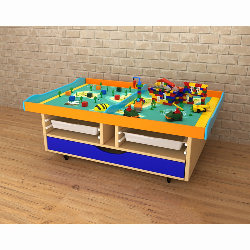 Расположенные на поверхности стола локации помогут формированию у детей картины мира и отдельных его составляющих. Локации ограничены друг от друга бортиками, это позволяет расположить одновременно на одном столе 2 совершенно разные развивающие игры. В полках стола можно хранить развивающие материалы, предназначенные для развития разнообразных навыков у детей.