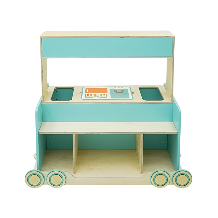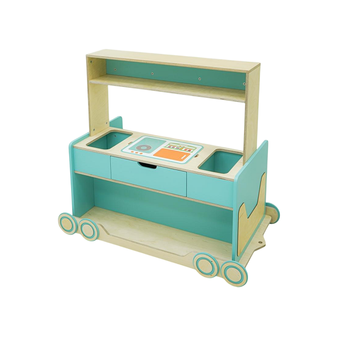 Тематический вагон. Единственный из всех имеет высокую полку для поделок и детских игрушек. А также выдвижной ящик посередине и два открытых отсека по бокам для тематического наполнения.