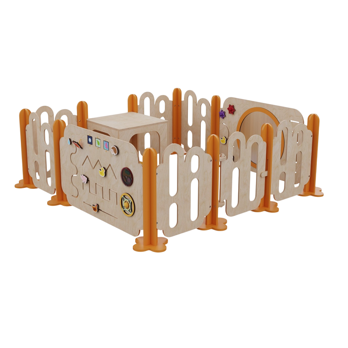 Манеж обеспечивает безопасность малышей, а дополнительные элементы конструкции — куб и бизиборды — расширяют игровое пространство и способствуют развитию координации, моторики и фантазии.