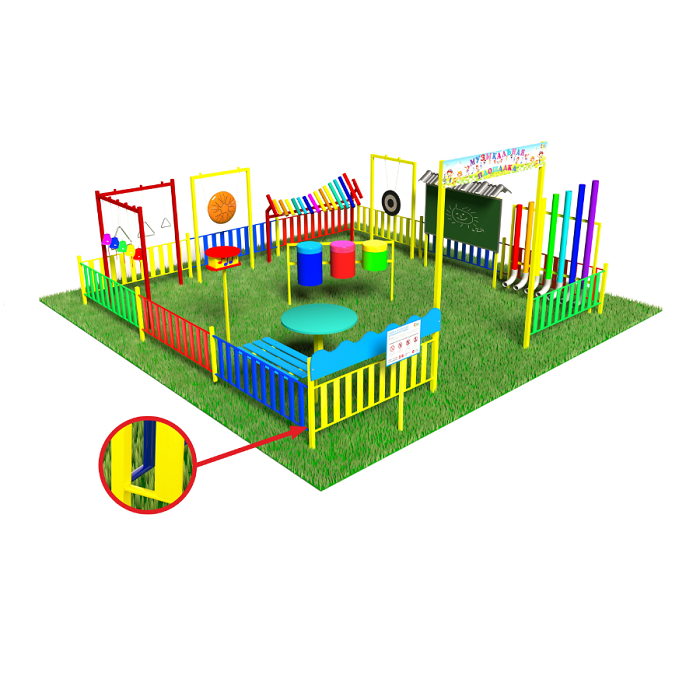 Комплекс предназначен для установки на территории детского сада, прост в использовании и подходит для занятий круглый год.
