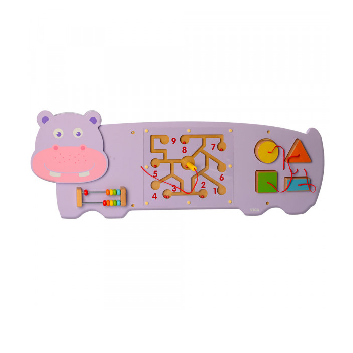 Игровая настенная панель "Бегемотик" предназначена для развития мелкой моторики, улучшает координацию движений, способствует обучению счета, развивает математические способности, знакомит с геометрическими формами.