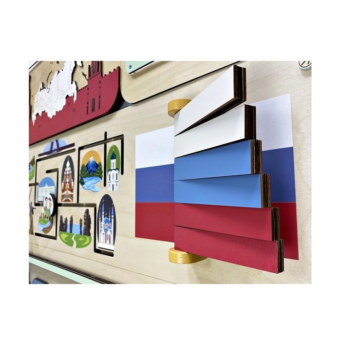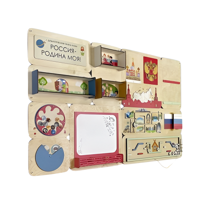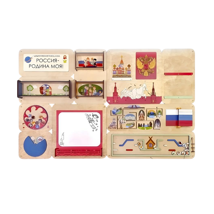 • Занятия с панелью «Россия - родина моя» способствуют патриотическому воспитанию подрастающего поколения. Дети в игровой форме знакомятся с нашей страной, культурой, символикой, картой страны и т.д. Разработаны игры на мелкую моторику, логическое мышление и внимание.