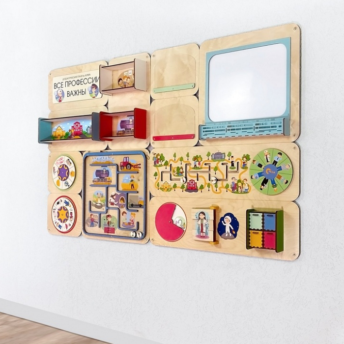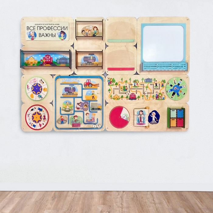 Главная Каталог Подготовительная группа и детский сад Сенсомоторное развитие Сенсорные панели для детей Дидактическая настенная панель «Все профессии важны»