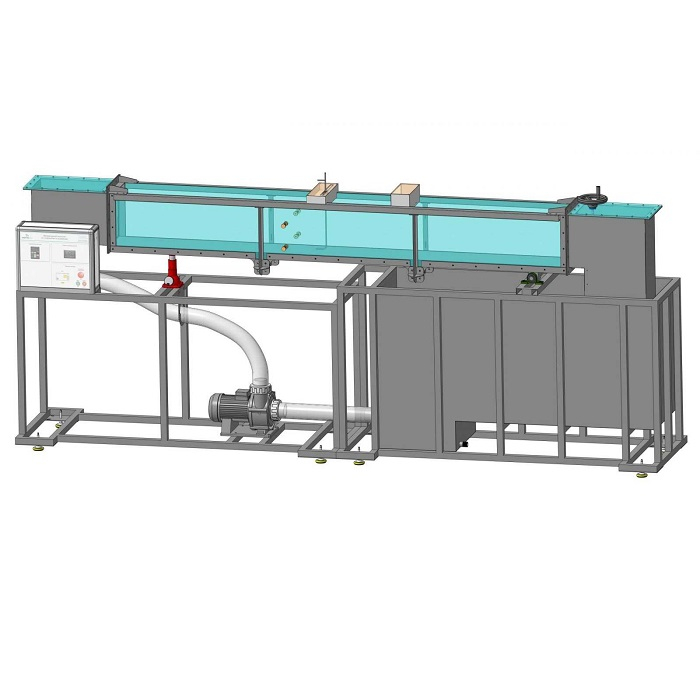 Проточная часть является основным элементам для проведения лабораторных работ. Проток представляет собой, сварную конструкцию из стали, с прозрачными вставками из акрилового материала, с механизмом качения и опорой для домкрата, также в конструкции имеются фланцы для присоединения напорного и сточного баков. В боковых частях протока, имеется механизм фиксации предназначенный для установки различных видов водосливов, разделителей и порогов. На выходе проточной части установлена механическая задвижка, изменение положения производятся при помощи рукоятки. Изменение угла наклона проточной части производится с помощью подъемного механизма. Измерение скорости потока осуществляется трубкой Пито.