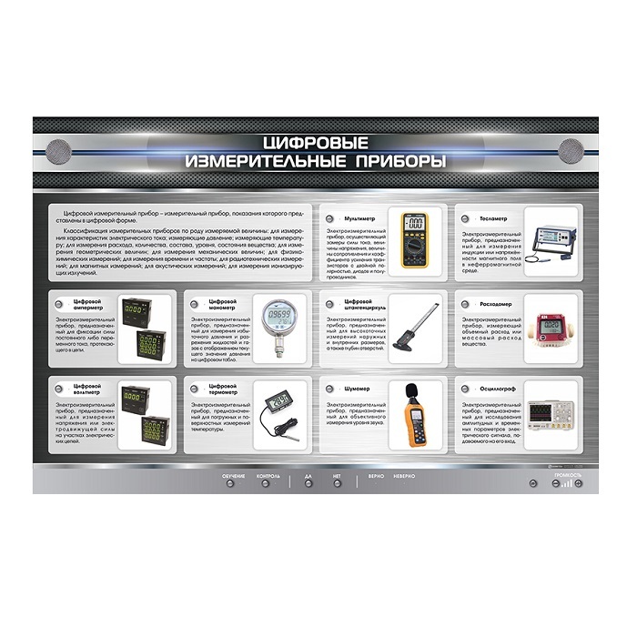 Электрифицированный стенд "Цифровые измерительные приборы" представляет собой полноцветную светодинамическую панель, на которой отображена информация о разновидностях и классификации цифровых измерительных приборов. В конструкцию учебного оборудования интегрированы высокочувствительные сенсоры для управления стендом при помощи интерактивного воздействия приемо-передающих устройств. Предусмотрено два режима работы со стендом: "Обучение" и "Контроль".