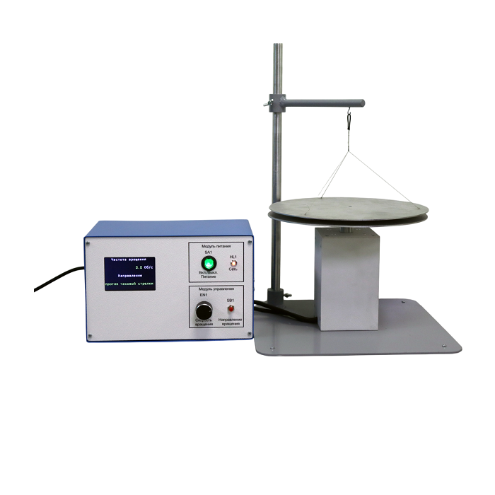 - наличие подвешенного на нитях вращающегося диска и диска, закрепленного на валу электродвигателя и установленного соосно на некотором расстоянии от первого, который приводится в движение с помощью встроенной измерительной системы;