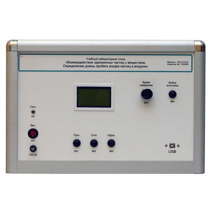 Учебный лабораторный стенд «Взаимодействие заряженных частиц с веществом. Определение длины пробега альфа-частиц в воздухе» (далее стенд), предназначен для проведения лабораторных работ с учащимися по курсу ядерная физика.