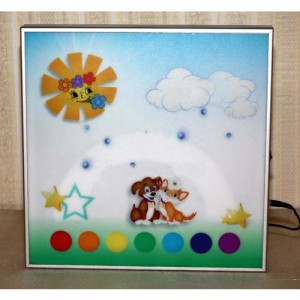 Световая панель "Аудиорадуга" имеет размеры 35х35см . Выполнена из ударопрочного пластика. Питание от трех батареек. Кнопка включения-выключения - на торце панели. На лицевой панели расположены 7 кнопок - семь цветов радуги. При нажатии кнопки с указанным цветом радуги - радуга загорается определенным цветом и раздается голос "радуги" , которая озвучивает выбранный цвет. Звуковую функцию можно отключать. При прикосновении к глазкам собачики - загораются глазки. При прикосновении к солнышку - подсвечивается солнышко. При прикосновении к облачку - загорается облачко. Данная панель помогает выучить основные цвета, развивает воображение, причинно-следственные связи.