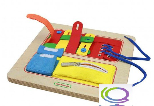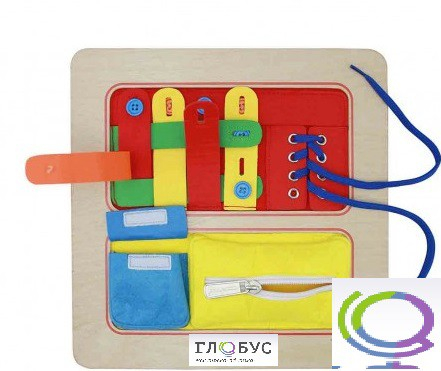 На поверхности панели закреплены цветные кармашки с липучками, кармашки на молнии, застежки с пуговицами, шнуровка, способствует развитию координации и мелкой моторики.