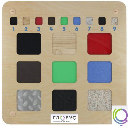 Настенная панель выполнена из березовой фанеры. На лицевой части в больших прямоугольных углублениях расположены 9 образцов различных материалов, для тренировки тактильных навыков. В верхней части панели расположены пронумерованные материалы, схожие с образцами. По углам панели размещены отверстия для крепления панели к стене.