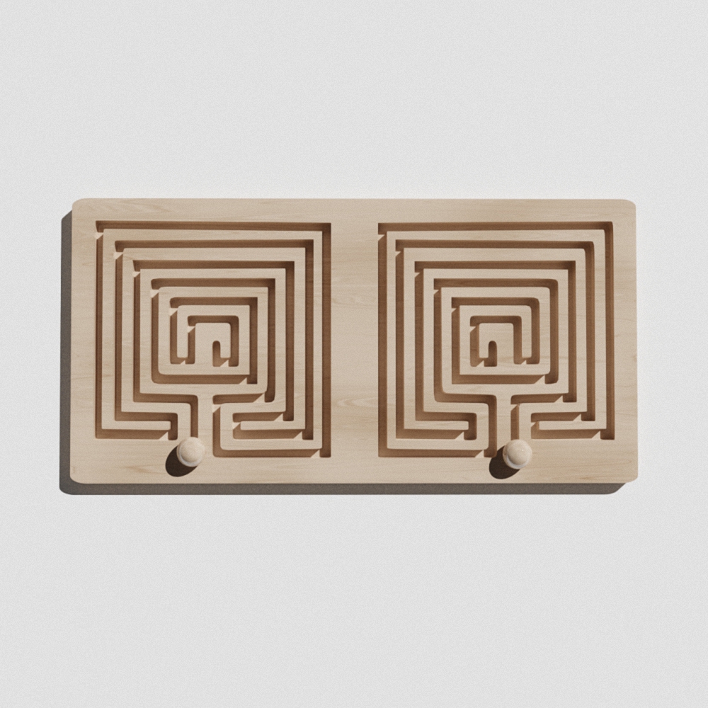 Малышу необходимо взять два бегунка и установить в лабиринте. Сначала двигать кружок по маршруту правой, затем только левой рукой, а после двигаться по траектории лабиринта обоими одновременно по часовой стрелке, а потом против. Упражнение помогает сформировать одновременную работу рук, глаз и обоих полушарий.